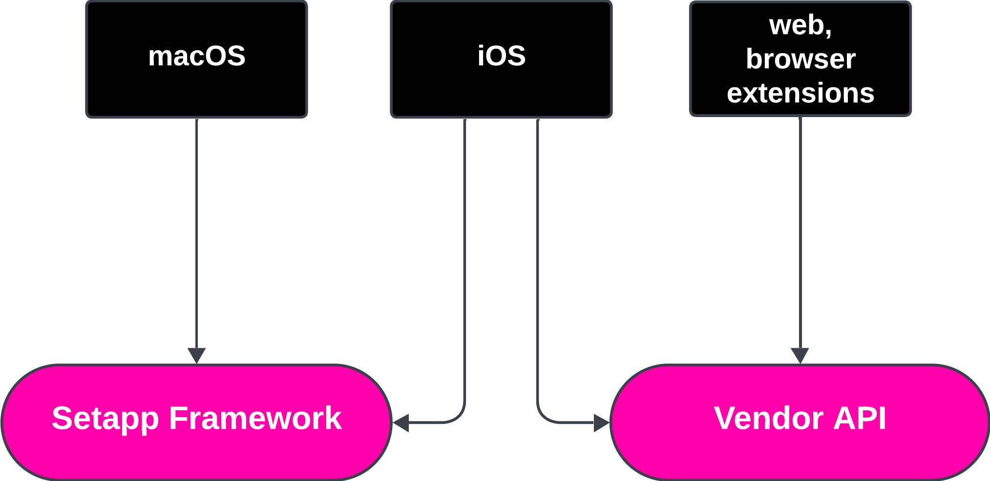 You are free to choose the way you prefer, but we'd recommend you align it with other platforms of your app, if any. For instance, if your app is also represented on macOS, select Setapp Framework to avoid extra work with integration. If you consider releasing your app on the web one day, choose Vendor API.